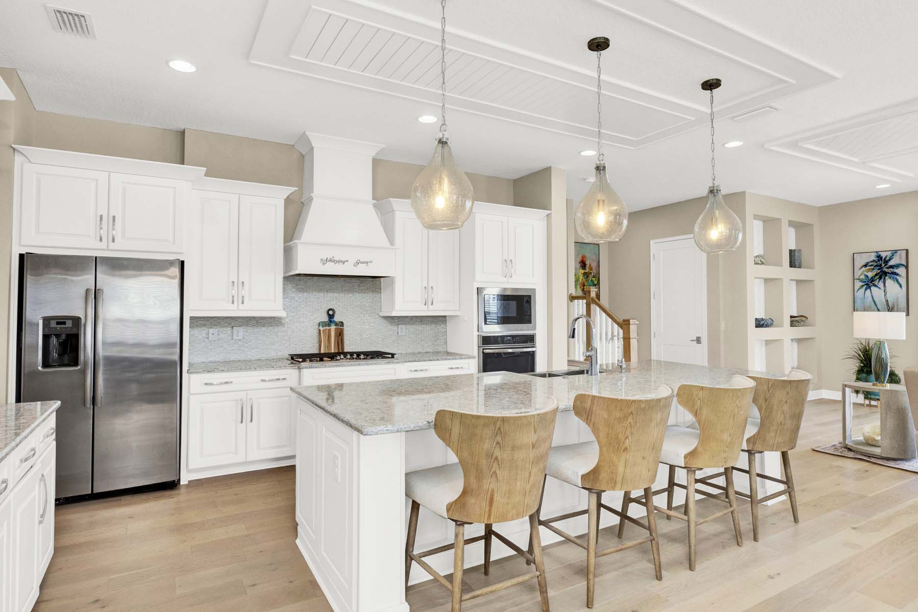The spacious floor plan has an open kitchen and family room with high ceilings, huge windows and upgraded flooring. A large outdoor patio has fabulous views of the beautiful lagoon and sandy beaches. Upstairs are 3 spacious bedrooms and a loft (which makes a nice play area or study). The owners suite has a wonderful bathroom, large closets and lovely balcony overlooking the lagoon. This home can be a great primary residence or a terrific lock-and-leave vacation home. The neighborhood of Beachwalk offers its residents fabulous amenities including the 14 acre lagoon, with sandy white beaches, a swim-up bar, a fitness center, tennis courts, dog park and putting green. Live every day like you're on vacation!