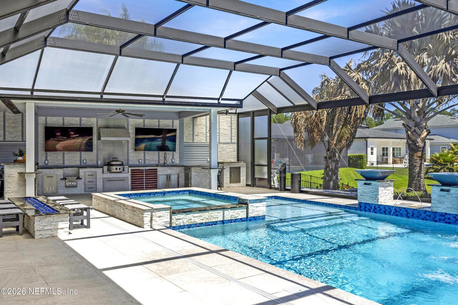 The main living areas flow effortlessly into an enhanced indoor-outdoor experience, where a resort-style backyard awaits. The screened pool enclosure features oversized 24" x 24" porcelain pavers for a sleek, low-maintenance finish. A custom-designed pool showcases striking fire bowls, cascading water features, and programmable color-changing lighting, creating a dramatic evening ambiance. The outdoor kitchen is IMPRESSIVE, complete with premium built-in appliances, expansive prep space, and dual mounted televisions--ideal for year-round entertaining.