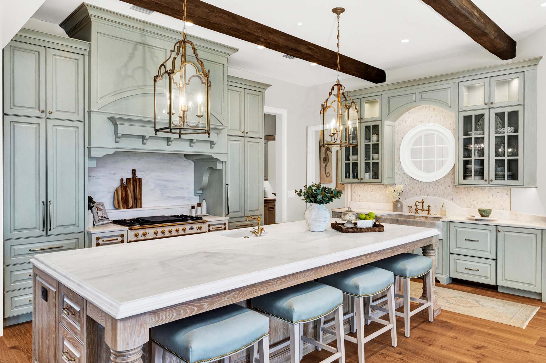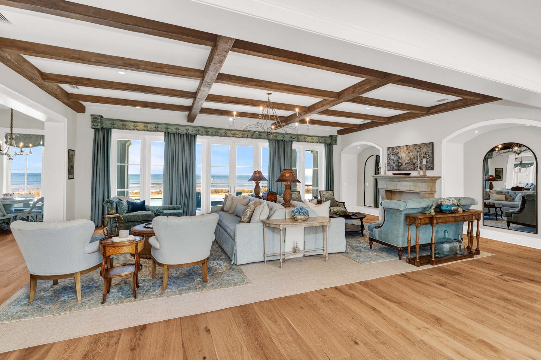 Beyond the gated entrance, a sweeping circular drive sets a stately first impression, framed by lush, professionally designed landscaping and impeccably maintained grounds. Inside, hand-hewn ash beams crown the living room, where a travertine fireplace and wide-plank white oak floors create a warm, grounded atmosphere. The kitchen is both functional and artful, anchored by a custom La Cornue range, Thermador refrigeration, Sub-Zero freezer drawers, marble sinks, and bespoke River City cabinetry. A catering kitchen and beverage room make entertaining effortless.The owner's suite is a true sanctuary, with a double-sided fireplace, French doors opening to the pool and ocean, a hand-carved marble soaking tub, a marble shower, and custom wardrobe and cabinetry. Ascend the striking wood staircase or take the convenient elevator to the second level, where three spacious bedrooms--each with a private, luxurious en-suite bath and stunning ocean views--surround a large gathering room with soaring cathedral tongue-and-groove ceilings. This gathering room opens onto a generous balcony overlooking the Atlantic.Outdoors, a summer kitchen, wood-burning fireplace, heated spa, cabana bath, and elevated dune walkovers create a seamless connection to the beach. This is an elegant, secure coastal haven designed for both grand entertaining and private escape. There is an additional building that is ideal for a home gym or a second office. This is what you've worked for--start living the dream.